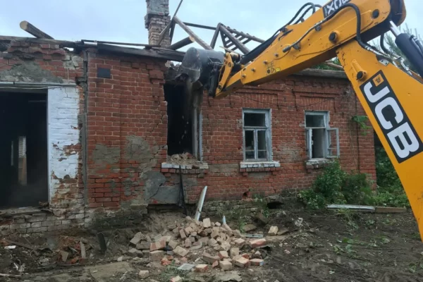 - Механизированный демонтаж — с использованием экскаваторов-гидромолотов. Быстро, эффективно, подходит для кирпичных и бетонных зданий.
