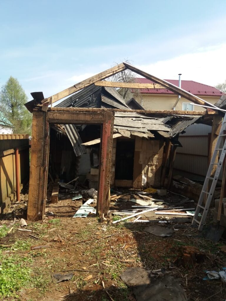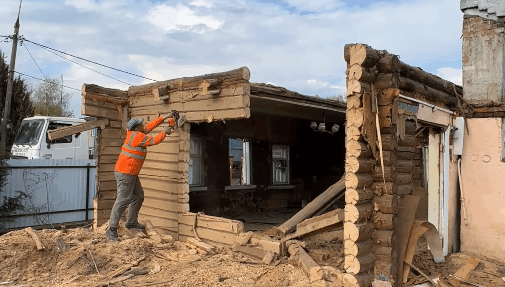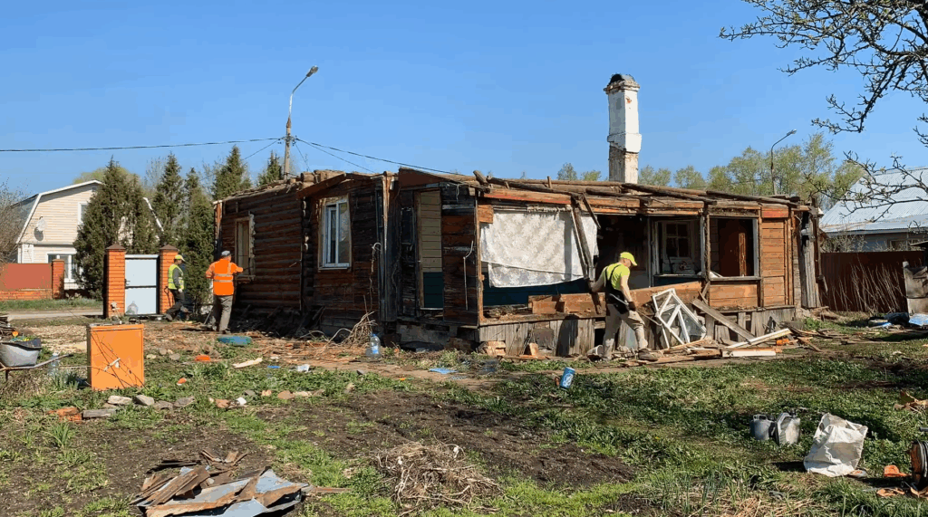 Если в доме что-то осталось — мебель, техника, стройматериалы — всё это аккуратно выносится. Также устанавливается ограждение, чтобы обломки и пыль не мешали соседям.