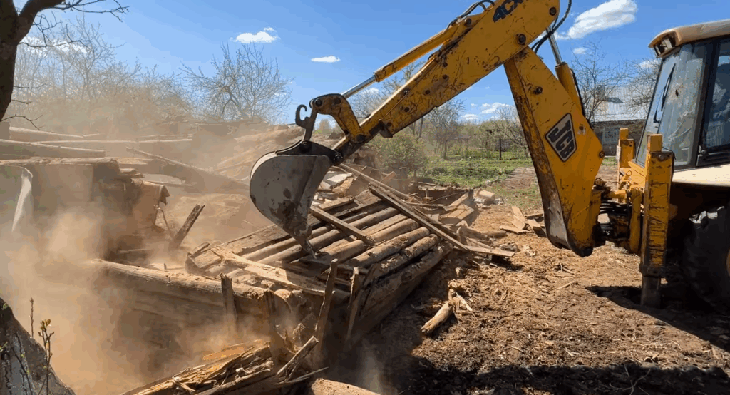 Один из важнейших этапов. Все строительные отходы (бетон, кирпич, дерево, металл) сортируются, часть отправляется на переработку, остальное — на полигон. Участок выравнивается и готовится к дальнейшему использованию.
