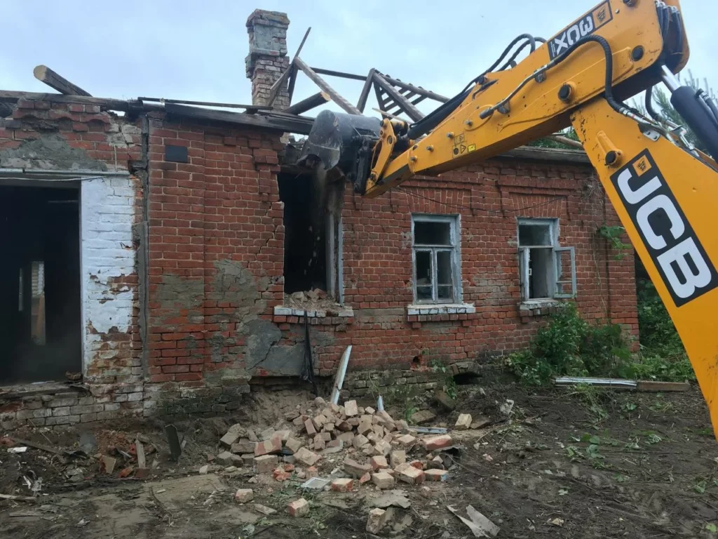 - Механизированный демонтаж — с использованием экскаваторов-гидромолотов. Быстро, эффективно, подходит для кирпичных и бетонных зданий.